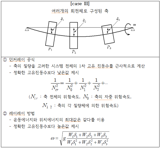 위험속도를 구하는 공식은 3가지 경우로 나누어 설명되는데 첫번째 경우는 중앙에 회전질량을 가진 축으로 가정할 때이고 두번째 경우는 축의 분포하중만 고려시이며 세번째 경우는 여러개의 회전체로 구성된 축의 경우 이다. 여러개의 회전체로 구성된 축은 던커레이 공식과 레이레이 방법으로 설명되는데, 이 중 던커레이 공식은 축의 질량을 고려한 시스템 전체의 1차 고유 진동수를 근사적으로 계산한 것으로 정확한 고유 진동수보다 낮은값을 제시한 수치이다. 그리고 레이레이 방법은 운동에너지와 위치에너지의 최대값은 같음을 이용하여 계산한 것으로 정확한 고유진동수보다 높은 값을 제시한 수치이다.